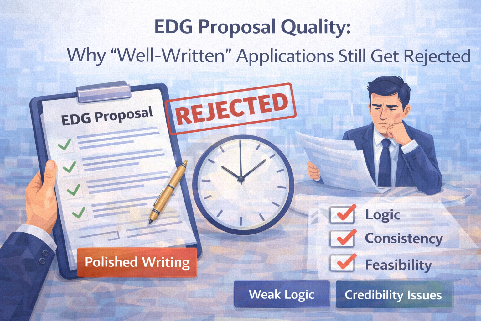 Strong EDG projects can still be rejected if they lack clarity, consistency, or credibility during evaluation. Case officers assess internal ownership, logical alignment, execution readiness, and risk—not just the idea itself. Common failure points include weak narrative structure, vendor-driven proposals, and insufficient justification. To improve approval chances, applications must be coherent, well-supported, and clearly demonstrate low execution risk.